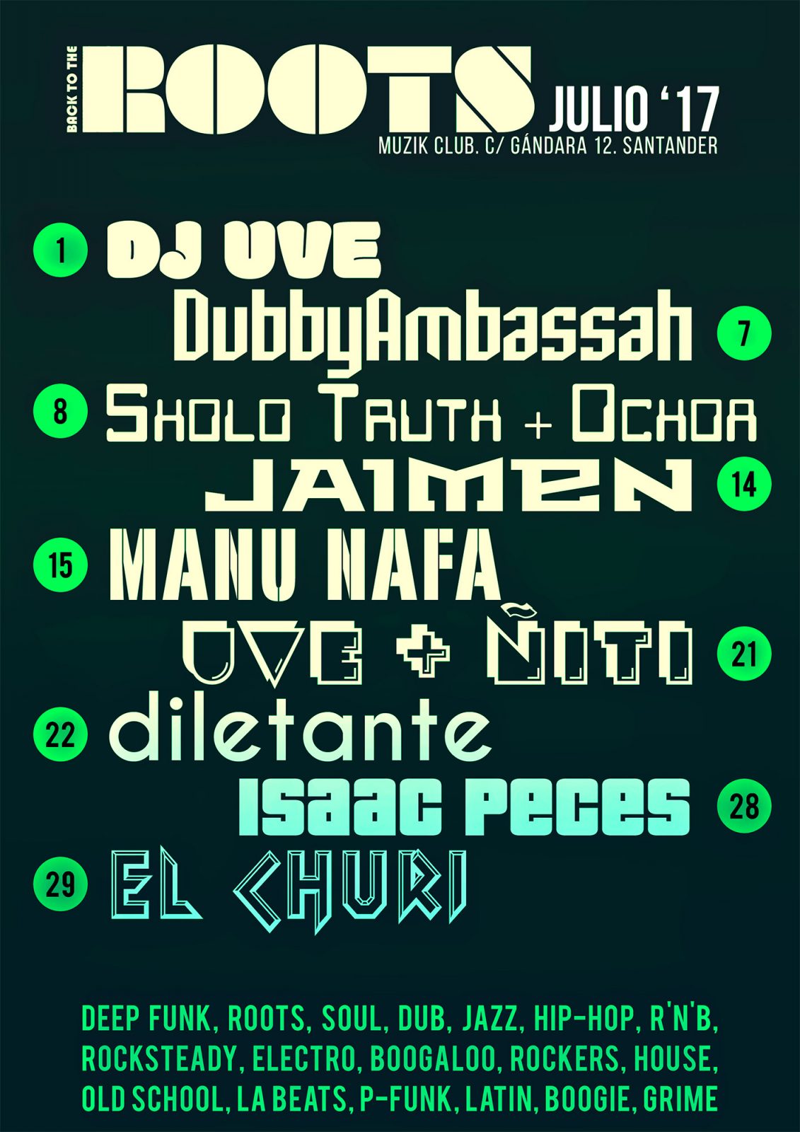 Cartel de DJ’s del Roots Santander en Julio de 2017